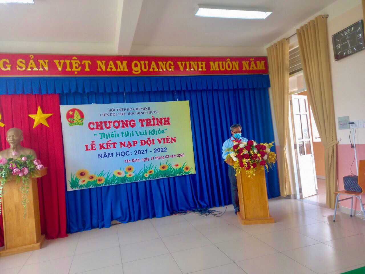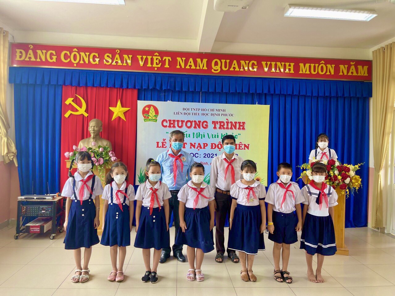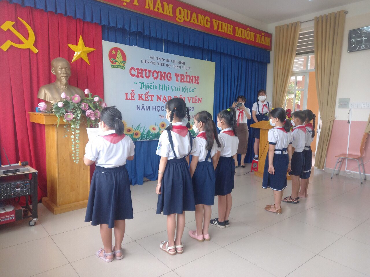 Thực hiện theo hướng dẫn của HĐĐ thị xã Bến Cát, về việc tổ chức các hoạt động thiết thực chào mừng các ngày lễ lớn. Thực hiện theo kế hoạch năm học của Liên đội trong công tác phát triển Đội năm học 2021-2022. Nhân kỷ niệm 91 năm ngày thành lập Đoàn TNCS Hồ Chí Minh (26/3/1931-26/32022), được sự đồng ý của BGH. Hôm nay vào lúc 14g ngày 31/3/2022, tại phòng Hội đồng Liên đội TH Định Phước tiến hành tổ chức chương trình " Ngày hội thiếu nhi vui khoẻ" và lễ kết nạp Đội cho nhi đồng khối lớp 3. Đến dự chương trình có anh Trần Tấn Phát - Chủ tịch hội đồng đội phường Tân Định; Cô Nguyễn Thị Nhàn - Phó Bí thư chi bộ - Phó Hiệu trưởng nhà trường; Thầy Lê Sĩ Hoàng - Bi thư chi đoàn; Thầy Lê Công Hoàng - TPT Đội; Cô Bùi Thị Lộc- Khối trưởng khối 3 ; Các thầy cô phụ trách lớp nhi đồng khối 3. Cùng 35 em nhi đồng khối 3 đại diện cho hơn 300 em nhi đồng được kết nạp Đội trong năm học 2021-2022.