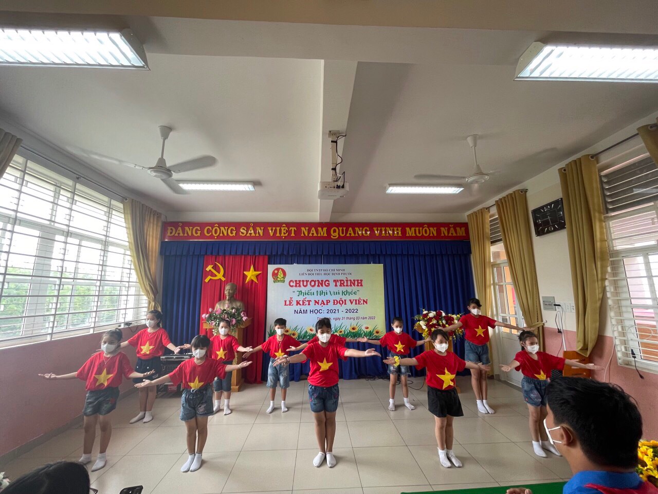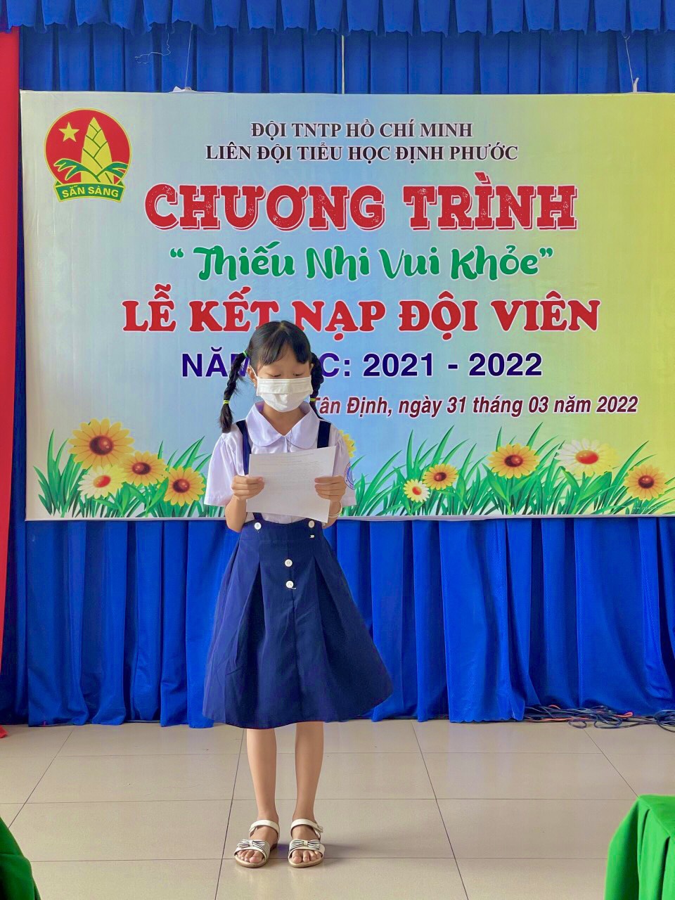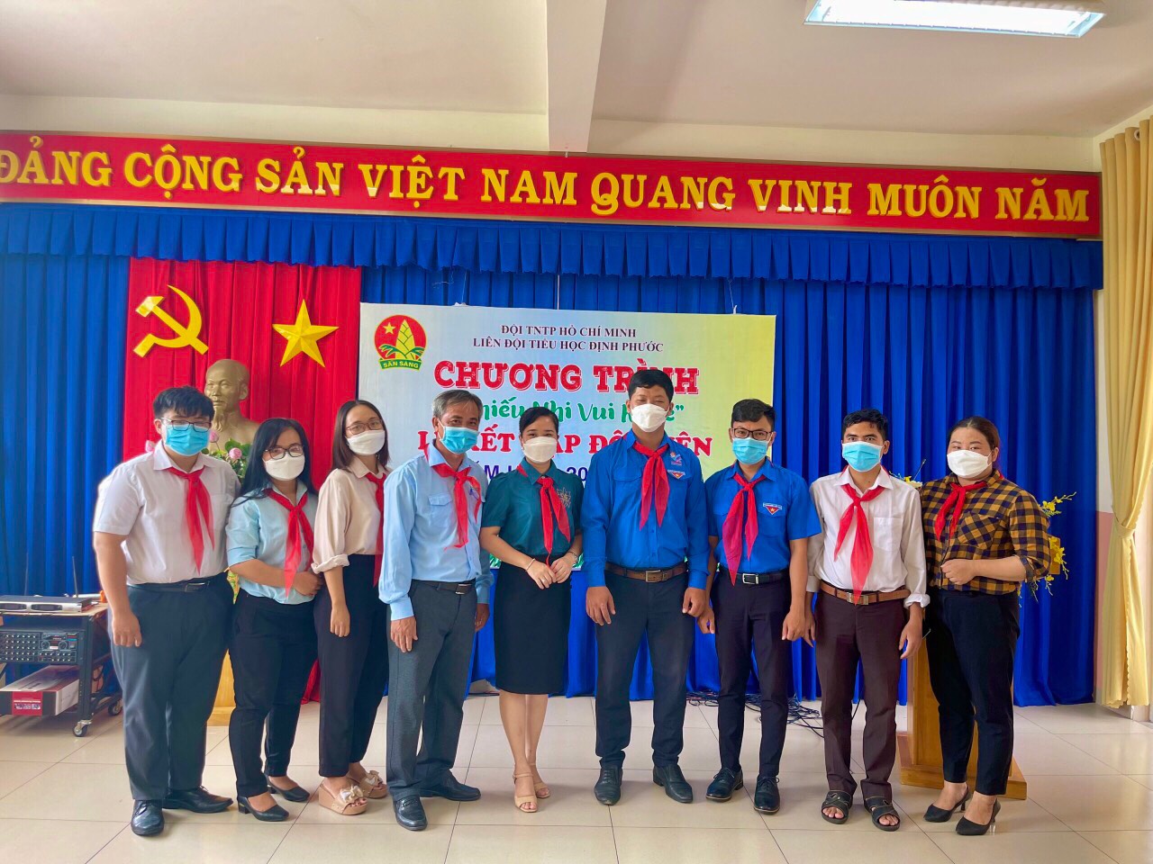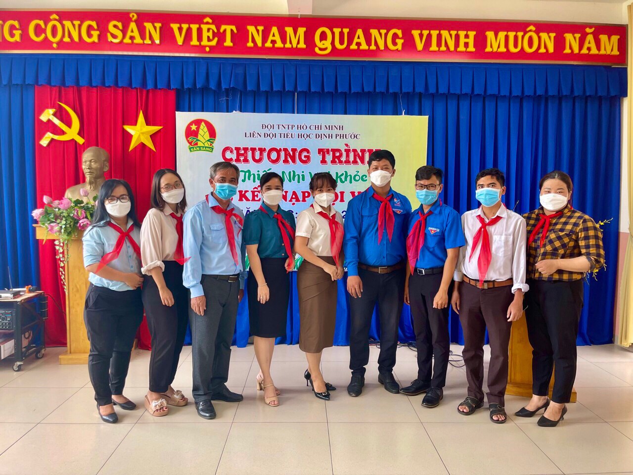 Thực hiện theo hướng dẫn của HĐĐ thị xã Bến Cát, về việc tổ chức các hoạt động thiết thực chào mừng các ngày lễ lớn. Thực hiện theo kế hoạch năm học của Liên đội trong công tác phát triển Đội năm học 2021-2022. Nhân kỷ niệm 91 năm ngày thành lập Đoàn TNCS Hồ Chí Minh (26/3/1931-26/32022), được sự đồng ý của BGH. Hôm nay vào lúc 14g ngày 31/3/2022, tại phòng Hội đồng Liên đội TH Định Phước tiến hành tổ chức chương trình " Ngày hội thiếu nhi vui khoẻ" và lễ kết nạp Đội cho nhi đồng khối lớp 3. Đến dự chương trình có anh Trần Tấn Phát - Chủ tịch hội đồng đội phường Tân Định; Cô Nguyễn Thị Nhàn - Phó Bí thư chi bộ - Phó Hiệu trưởng nhà trường; Thầy Lê Sĩ Hoàng - Bi thư chi đoàn; Thầy Lê Công Hoàng - TPT Đội; Cô Bùi Thị Lộc- Khối trưởng khối 3 ; Các thầy cô phụ trách lớp nhi đồng khối 3. Cùng 35 em nhi đồng khối 3 đại diện cho hơn 300 em nhi đồng được kết nạp Đội trong năm học 2021-2022.