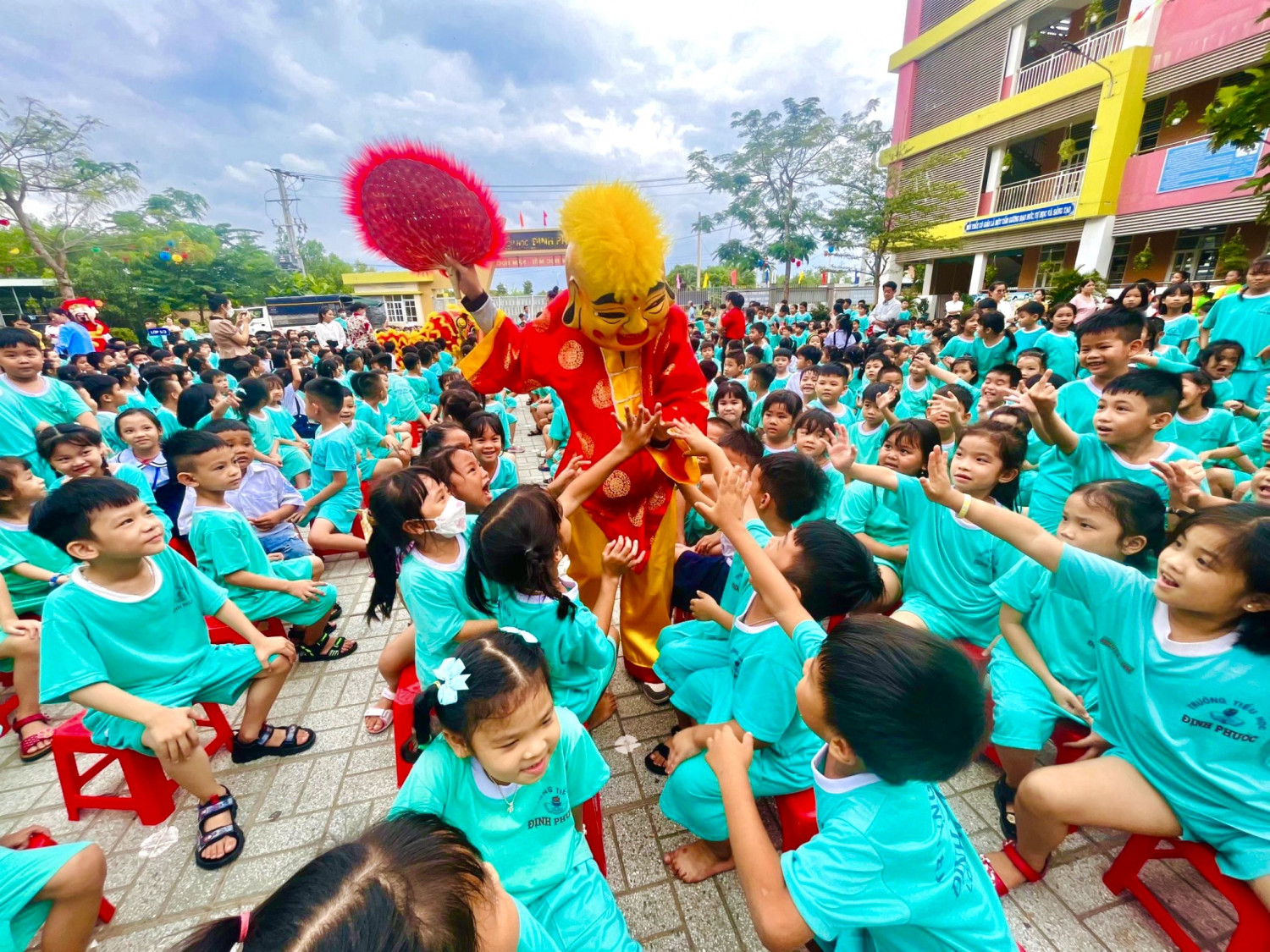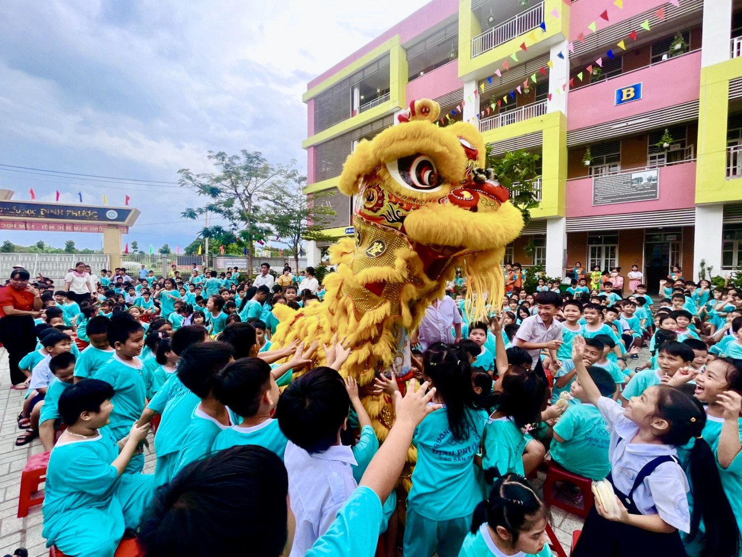 Học sinh trường Tiểu học Định Phước cùng nhau xem múa lân